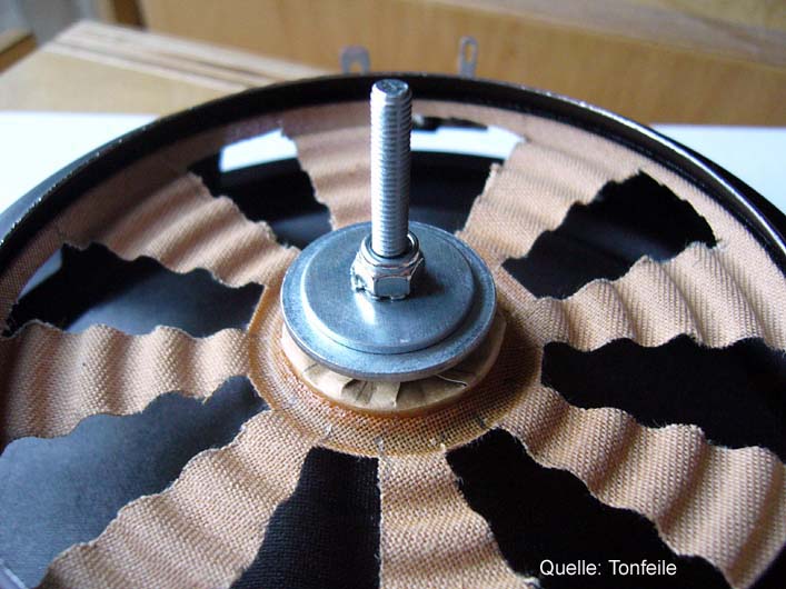 Den Weg, den Tonfeile bei der Tafal beschritten hat ist etwas mühsam. Hierzu wird ein einfacher 17er Papiertieftöner - in diesem Fall ein Visaton WS 17 E - seines Antriebes beraubt und über Zusatzgewichte am Schwingspulenträger und eine Modifikation der Zentrierspinne auf die gewünschten Parameter getrimmt. Um an dieser Stelle niemanden den Nachbau der Tafal gleich wieder madig zu machen, sei erwähnt, dass man selbstverständlich auch eine fertige Passivmembran in passender Grösse kaufen kann. Diesen Chassis liegen meist auch mehrere Gewichte bei, über die die Abstimmfrequenz einstellbar ist. Einen Vorteil hat der WS 17 E allerdings: Er hat einen sehr schmalen Korbrand und ist somit ohne das Gehäuse der Tafal zu verbreitern gut auf deren Rückseite verbaubar. Trotzdem hat er gut 80 Prozent mehr Membnranfläche als der aktiv betriebene AL 130. Dieses Flächenverhältnis sollte man möglichst nicht unterschreiten, da ansonsten das Impulsverhalten leidet.