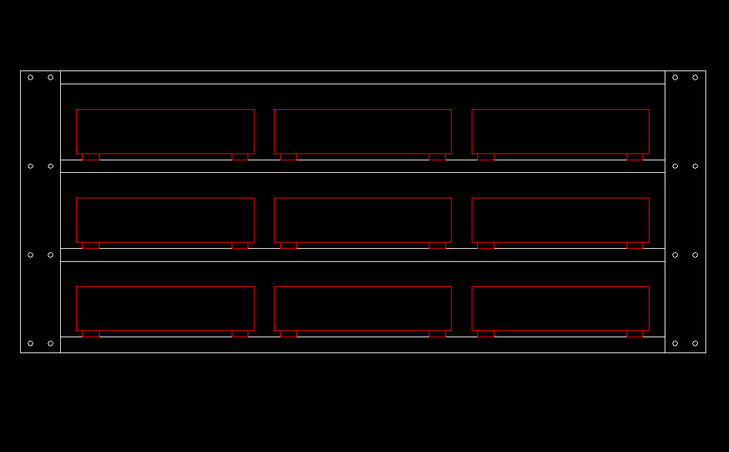 Im Bild oben ist das Rack von vorne unbemasst in der Gesamtdarstellung zu sehen. Mit den roten Linien ist ein Standard Gerätegehäuse dargestellt.