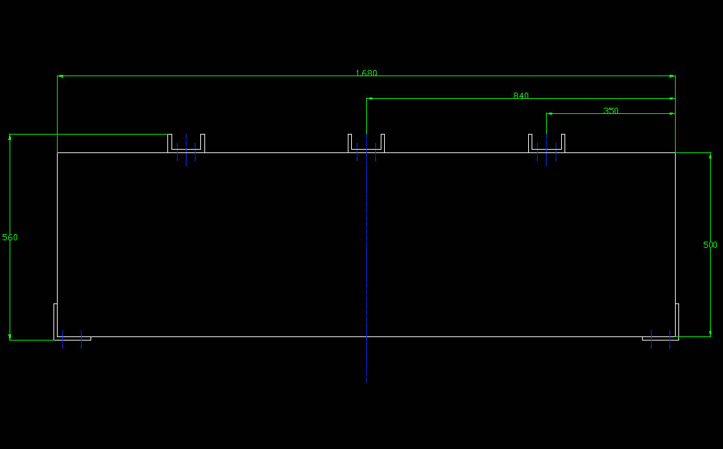 Bild 2: Das gesamte Rack mit Bemassung in der Aufsicht. Es sind selbstverständlich Variationen der hinteren Vertikalprofile möglich. Denkbar wären z.B. T-Profile oder analog zu Burmester ebenfalls L-Profile. Bei voller Breite wäre dann allerdings eine zusätzliche Abstützung in der Mitte ratsam. Ich empfinde die 3 eingerückten hinteren Vertikalprofile geben dem Design eine gewisse Leichtigkeit - das ganze wirkt so weniger kastenförmig. Zudem ist dieses Design näher am Timmermannschen klangoptimierten Design, da die Anordnung der Profile so gewählt ist, dass jedes Gerät quasi eine 3-Punkt-Abstützung sieht.