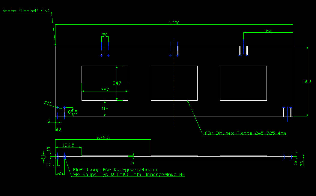 Zu Bild 1: Die Gesamtdicke wurde durch das Verleimen von zwei 18 mm Multiplexplatten erreicht. Das gibt die Möglichkeit Ausfräsungen in den Platten mit dämpfenden Material zu füllen. Ich habe 4 mm Bitumeplatten gewählt. Möglich wären beispielsweise auch Sand- oder Sand-Bleischrotfüllungen, Hawophon-Stahlkugelmatten und eine Lage Filz odere andere schwere Materialien. Man sollte es allerdings nicht übertreiben, denn schon meine Version ist ziemlich schwer und bei einem Aufbau auf schwingenden Altbauböden wäre evtl. bei einer "Befüllung" mit schweren Endstufen im Tri-Amping und mehreren Monster-Masselaufwerken ansonsten ein "Duchhängen" in Richtung "Untermieter" zu befürcheten. Auf die Fräsungen für die Gewindebolzen habe ich letztendlich verzichtet, da sich eine Untermassbohrung (ca. 5 mm für M6) und dann das Einschneiden eines Gewindes ins Multiplex mit 80 mm Edelstahlschrauben als mehr als ausreichend stabil erwiesen haben.