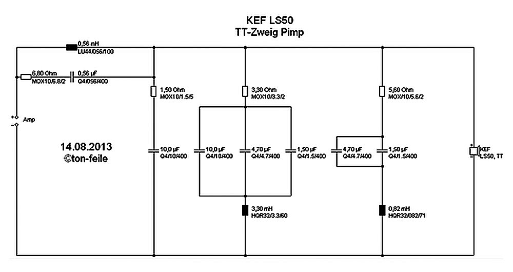 Bild 2: Der komplett beschriftete Tieftonzweig von Tonfeile für Aufrüstwillige. Der Topologie ist die nicht ganz triviale Entzerrung des von Haus aus wenig linear spielenden Tiefmitteltöners zu entnehmen. Trotz des hohen Aufwandes kommt Tonfeile mit nur einer Spule in Reihe aus.