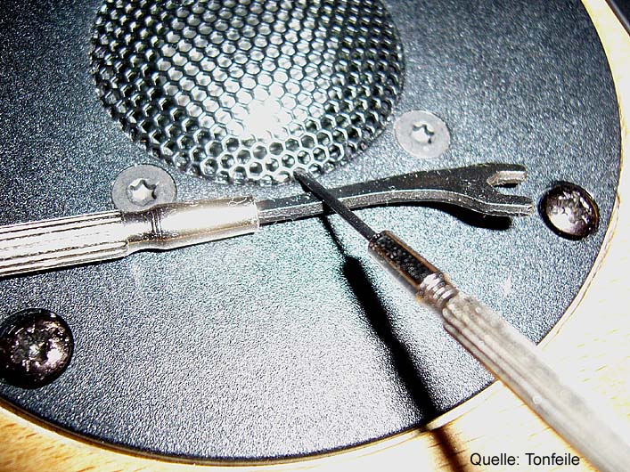 Wie im vorangegangenen Kapitel bereits erwähnt, empfiehlt Tonfeile eine mechanische Hochtonmodifikation: Das Entfernen des Diffusors beim TAF 27. Dieser versteckt sich bei der Seas Kalotte als transparente Scheibe auf der Innenseites des Schutzgitters. Dies ist zwar optisch unauffällig, hat aber einen hörbaren Einfluss auf das Abstrahlverhalten des Hochtöners. Der ursprünglich einmal vorgesehene Saugkreis zur Linearisierung des Frequenzgangs kann ohne den Diffusor entfallen.