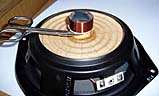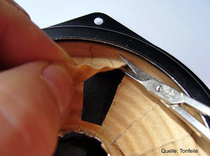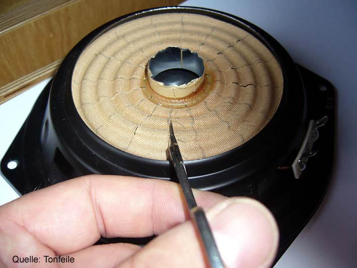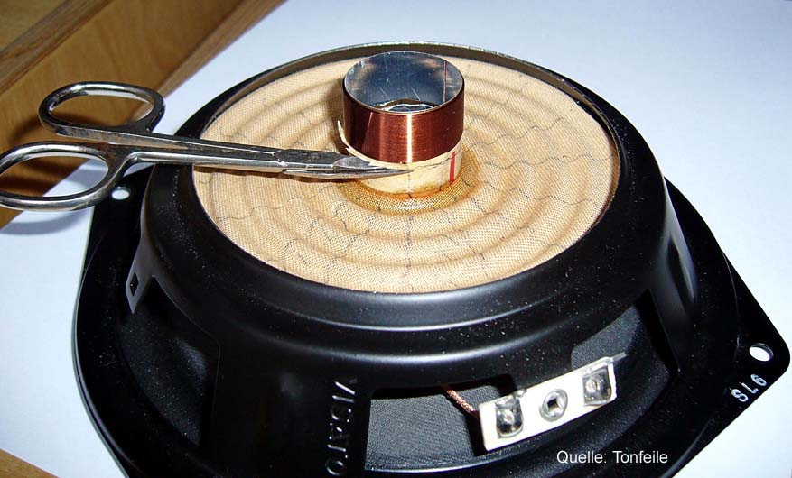 Bild 1: Nachdem der Antrieb entfernt ist, wird die Schwingspule abgeschnitten. Ein Stück vom Schwingspulenträger bleibt stehen. Dieser dient später als Basis für das Gewicht.