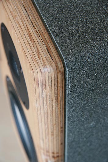 Bild: Das Bild sagt mehr als 1.000 Worte - 25 mm starke Multiplex-Frontplatte mir 25er Radien um den Hochtöner, Schattenfuge zum MDF-Korpus, der mit einem Graniteffektlack und anschliessend mit Klarlack besprüht ist.