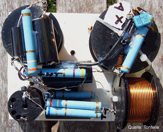 Wenn man nun alle Frequenzweichenbauteile direkt miteinander verlötet, sieht das in etwa so aus wie auf obigem Bild. Für Löt-Ästheten geht das sicher auch in Schöner. Und angesichts des sich durchaus ergebenden highendigen Anspruches des Lautsprechers, darf gerne auch mit noch wertigeren Bauteilen, wie Folienspulen und verlustärmeren Kondensatoren und Widerständen experimentiert werden. Die von Tonfeile gewählten Komponenten geben aber erwiesenermassen schon eine sehr gelungene Vorstellung ab. Aber ich will hier nicht vorgreifen...