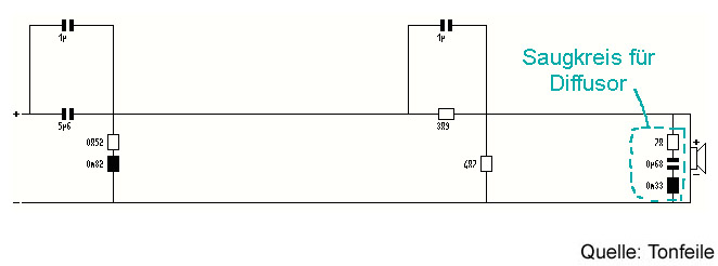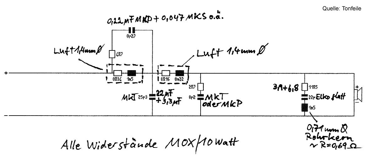 Die genauen, auch messtechnisch erfassbaren, Effekte der Modifikationen werden im Kapitel Messen dargestellt. Eine Empfehlung - auch aus meiner Erfahrung - ist, beim Hochtöner den Diffusor zu entfernen und den Hochpass aus Bild 1 ohne Saugkreis aufzubauen.