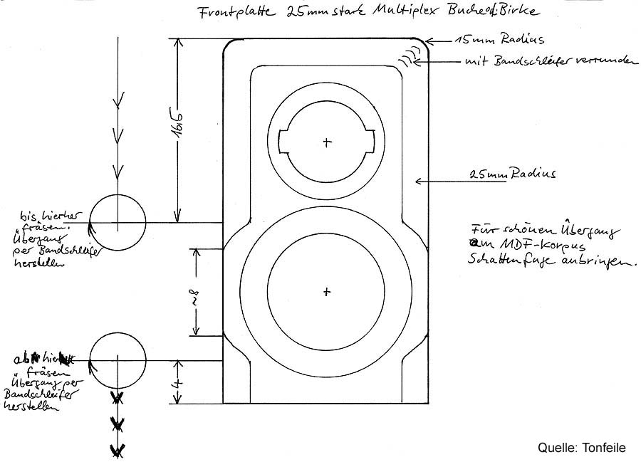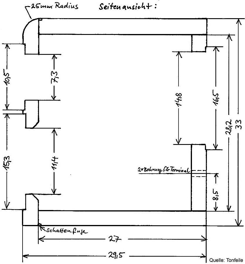 So gibt es auch bei der Tafal keine Notwendigkeit für aufwendige Matrix-Innenkonstruktionen oder modische Freiformflächen. Dem geneigten Selbst-Nachbauer stellen sich also keine unüberwindbare Hindernisse in den Weg. Zwei Besonderheiten sind allerdings unbedingt zu beachten, da sie entscheidenen akustischen Beitrag zum Konzept leisten: