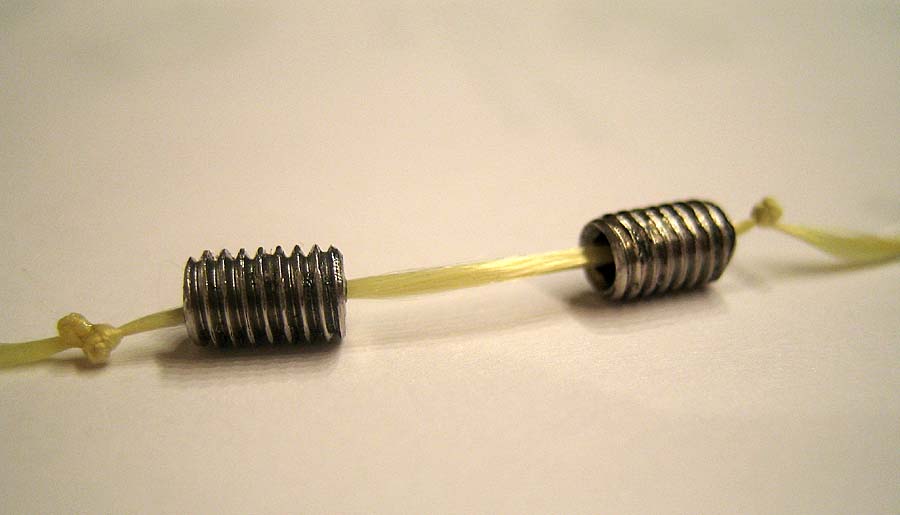 Als guten Kompromiss aus hoher Zugfestigkeit und Steifigkeit bei gleichzeitiger "Knotbarkeit" haben sich schliesslich die Aramid-Fasern herausgestellt. Die entsprechende Konfiguration aus Bild 2 ist trotzdem nach ein paar Tagen am Knoten abgerissen. Kurzfristig war ich geneigt zu glauben, Frank Schröder habe tatsächlich einen unbekannten Wunderstoff aufgetan. Hat er wahrscheinlich nicht: So stellte sich schliesslich ein kleiner Grat an der Senkschraube (im Bild 2 rechts an der linken Schraube andeutungsweise zu erkennen) als der Übeltäter heraus. Dieser schnitt beim festen Anschrauben der Senkschraube an den Magnet die Aramid-Fasern an un. Diese Vorschädigung führt schliesslich bei Torsion der Multifilamente zum Bruch. Abhilfe schaffte schliesslich das Entgraten der kleinen Durchgangsbohrungen und ein nicht allzu festes Anpressen des Knotens an den Magneten.