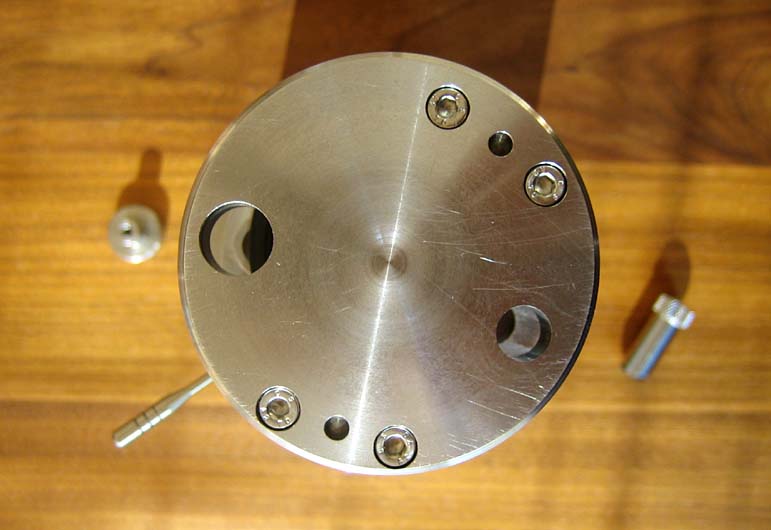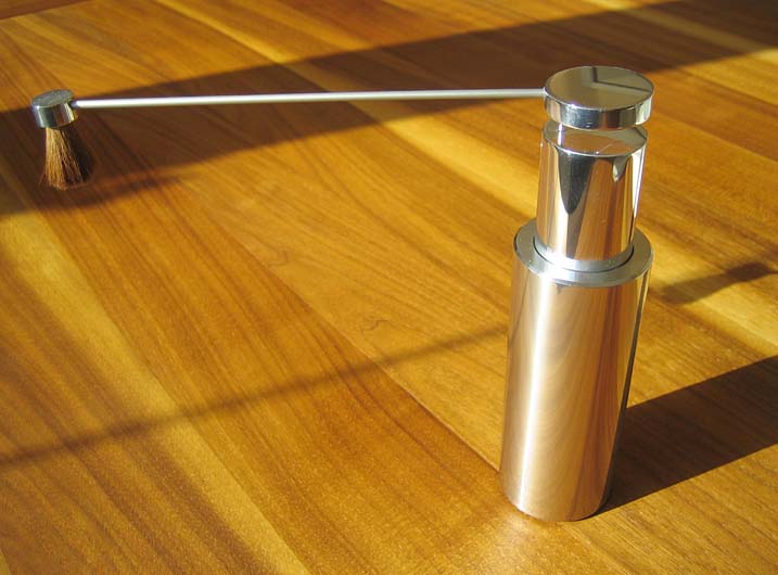 Da mein Modellbauer eine so saubere und masshaltige Arbeit geliefert hatte, qualifizierte er sich zusätzlich für die Fertigung einer polierten Aluminiumbasis für den Transrotor-Mitlaufbesen. Die Firma Transrotor zeigte sich auf eine entsprechende Anfrage hin weniger hilfreich (oder auch nur freundlich). Das Ergebnis (Bild 1 und 2) steht im Finish dem Transrotor in Nichts nach.