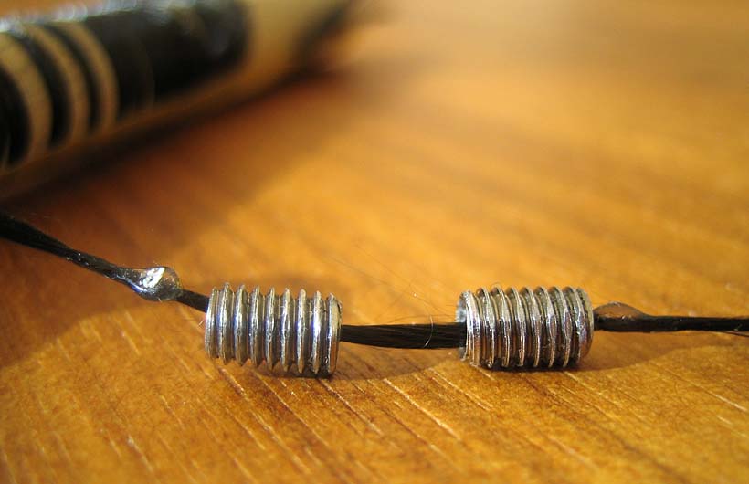 Wie unter Punkt 4 beschrieben sind C-Fasern nicht knotbar (ich habe es trotzdem probiert und die Haftkräfte der Magnete zu spüren bekommen), die Eigenschaften für das Vorhaben aber ansonsten perfekt: Nahezu vernachlässigbare Dehnung (noch unterhalb von Aluminium) und sehr hohe Festigkeit. Daher wollte ich nicht zu früh aufgeben und habe mit 300er 2-Komponetenkleber (im Backofen erreichbare maximale Endfestigkeit von 3000 N/cm2, von der bei Raumtemperatur immerhin noch knapp die Hälfte übrig bleibt) kleine Klebertropfen anstelle der Knoten angebracht: Bild 1.