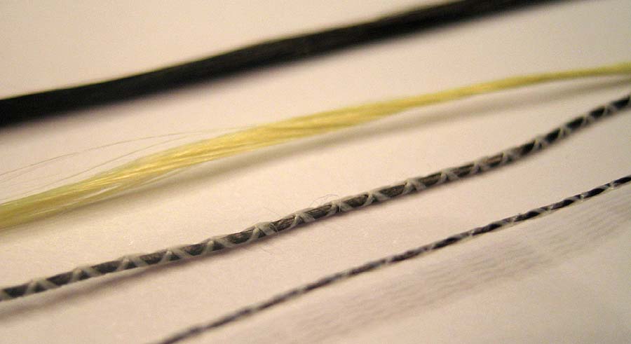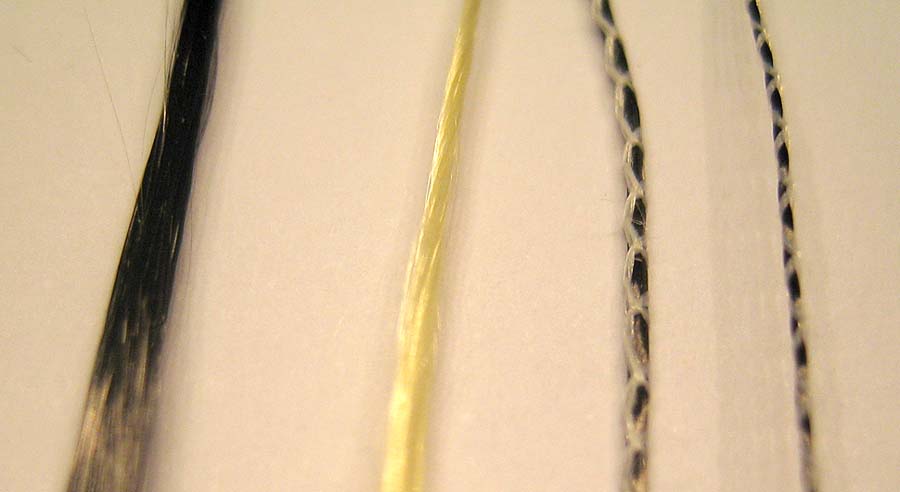 Die folgenden in Bild 1 und 2 zu sehenden Multifilamente standen, unter der Berücksichtigung der genannten Anforderungen, zur Verfügung: Ganz links - Carbon-Multifilament mit ca. 6000 Einzelfilamenten, zweite von links - Aramid-Fasern (Kevlar) aus 1000 Einzelfilamenten, dritte von links - PS-umhäkeltes Carbon-Multifilament aus 3000 Einzelfilamenten und rechts - Selbiges aus 1000 Einzelfilamenten.