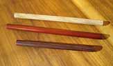 Im Bild 1 sind (von oben) Holzrohre aus Esche, Fernambuk (für bis zu 12 Zoll) und Königsholz (9-10 Zoll) zu sehen. Ersteres ist unbehandelt und wurde in etlichen Längen und ohne Schwierigkeiten von meinem (unaudiophilen) Schreiner gefertigt. Die beiden anderen Rohre lieferte Musical Life zu.