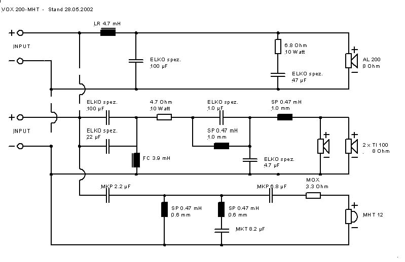ACHTUNG! Diese Weiche (Bild 1) entspricht nicht mehr dem aktuellen Stand und ist auch nicht mehr auf der Visaton-Page verfügbar, da sie durch ein (besseres) Update abgelöst worden ist. Dieser Plan wird hier nur der Vollständigkeit halber aufgeführt, da auch die ersten Höreindrücke mit dieser entstanden. Die aktuelle Weiche findet man unter Updates oder besser (da auf jeden Fall aktuell) bei Visaton unter Forum/Modifikationen.