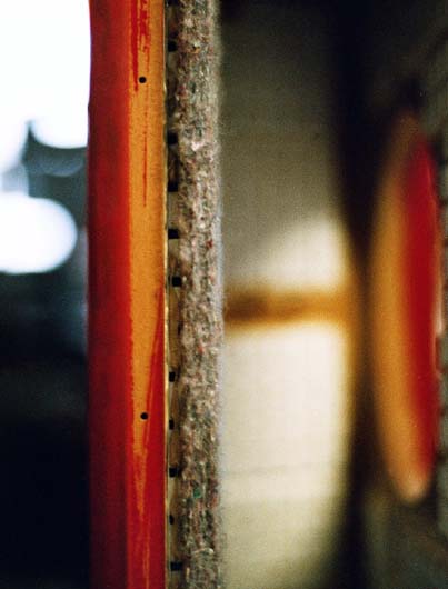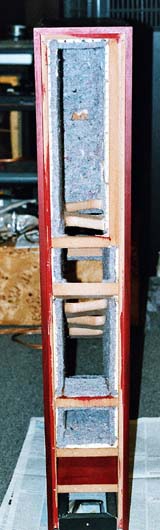 Auf Bild 4 ist das Gehäuse bereits komplett mit Stahlkugelmatten und Filz ausgekleidet. Bereits jetzt (ohne Front- und Rückwände) ergibt der Klopftest ein im besten Sinne "akustisch totes" Gehäuse, das jegliche Gedankenspiele mit Sandwich- oder Schiefergehäusen schnell vergessen lässt. Im Detail ist der Aufbau einer Seitewand noch einmal im Bild 5 zu sehen: 22 mm MDF, Stahlkugelmatte und 11 mm Filz.