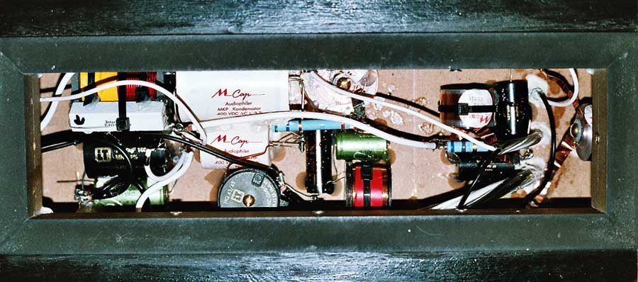 Bild 2: Nicht schön aber funktional der Aufbau der Weiche im druckfreien separaten Sockel des Gehäuses. Wann immer möglich wurden die Bauteile direkt aneinander gelötet. Ansonsten wurde das auch für die Innenverkabelung und Zuleitung verwendete Kabel Black&White LS800 bzw. LS300 (Hochtöner) verwendet. Die Spulen sind selbstverständlich verschraubt und liegen zur Vermeidung von gegenseitiger Induktion möglichst weit auseinander und nicht parallel zueinander. Um Mikrofonieeffekten vorzubeugen wurden manche Bauteile und Leitungen zudem mit Heisskleber fixiert und beruhigt - auch nicht schön, aber eben zweckmässig. Im Groben ist links im Bild der Tiefpass, in der Mitte der Bandpass und rechts der Hochpass zu sehen. Wie zu sehen wurden durchweg hochwertige Bauteile verwendet (insbesondere bei solchen die direkt im Signalweg liegen), auch wenn Visaton und einige Selbstbauer hierauf keinen Wert legen, haben mich die positiven Erfahrungen mit verzerrungsfreieren und verlustärmeren Weichenbauteilen (unter Tuning) zu diesem - wenn auch kostspieligen - Schritt bewogen. Dazu wurde - je nach Verfügbarkeit und Einsatzzweck - sowohl auf Bauteile von