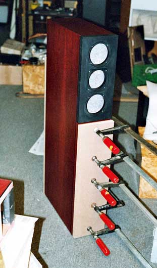 Die Aluplatte, die später die Chassis tragen soll, ist bereits verklebt und sicherheitshalber mit einer Klebespritze von innen nachgedichtet; die 28mm MDF-Frontplatte ist mit Leimauftrag zum Aushärten fest verspannt (Bild 1). Auf Bild 2 ist der Probeverbau des TI100 und des MHT12 in der Aluplatte zu sehen. Die Zentrierspinne des TI100 ist grosszügig hinterlüftet. Damit dies auch im Einbau Sinn macht, besitzt auch der Ausschnitt der Aluplatte eine grosszügige Fase.