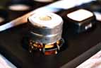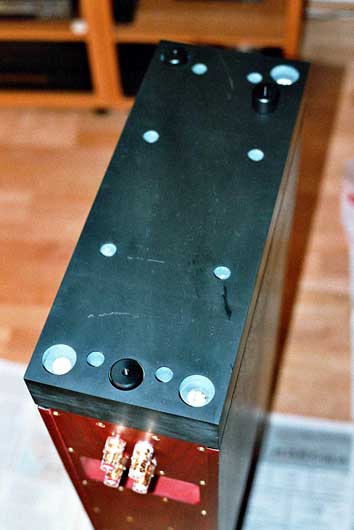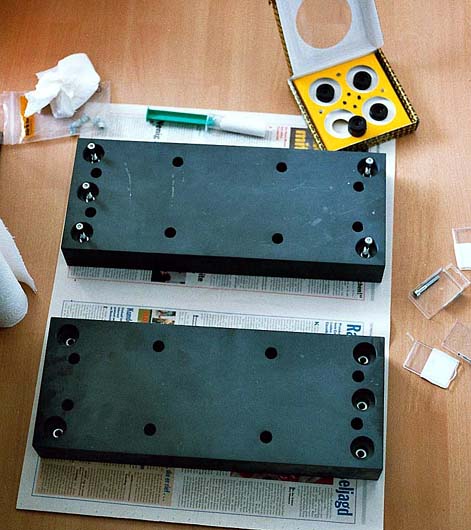 Zur Verschraubung der Antispikes mit dem Schiefersockel werden Gewindehülsen in die dafür vorgesehenen Ausfräsungen verklebt. Im Bild 3 sieht man oben den dazu verwendeten Montagekleber in einer Spritze und die Schauben als Einbauhilfe zur korrekten Ausrichtung der Gewindehülsen. Nach Aushärten des Klebers werden diese einfach wieder herausgeschaubt - zu sehen unten im Bild. Die 8 kleineren Bohrungen dienen zur Verschraubung des Schiefersockels mit dem Gehäusesockel. Auf Bild 4 ist dies bereits geschehen und 2 von 3 Antispikes sind bereits mit den von Audioplan geleiferten Gewindestiften aus dem gleichen Material verschraubt. Hierbei werden die Antispikes nur leicht angeschraubt und nicht extrem fest gezogen um die Dämpfungswirkung nicht zu stark zu unterdrücken. Theoretisch liesse sich so ein Feintuning hinsichtlich der Kombination aus Ankoppung und Entkoppelung erzielen. Auf dem Parkettfussboden erwies sich die Kombination aus Schiefersockel und 3 Antispikes (4 waren aufgrund des Bodens zu kippelig) als genau richtig - aber dazu später unter