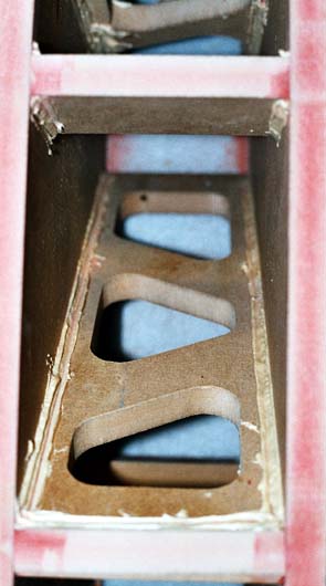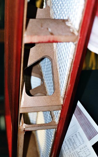 Auf dem ersten Bild ist das gelieferte Rohgehäuse (noch ohne Front- und Rückwände) zu sehen, das dank seiner Versteifungen schon in dieser Form einen sehr stabilen Eindruck macht - da kann eine Orignal VOX 200 (im Hintergrund) nur neidisch gucken. Auf dem zweiten Bild sind schon gut die asymmetrischen Versteifungen im Detail zuerkennen: Oben im Bild die horizontale Versteifung unter den Chassis; darunter die grosse Querverstrebung zur Beruhigung der grossen Gehäusefläche.