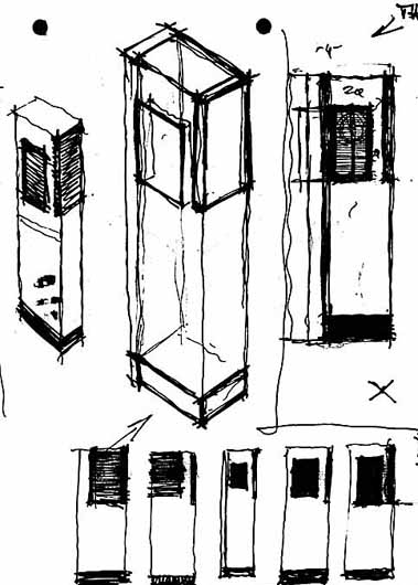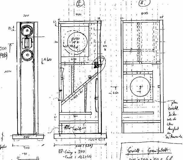 Das linke Bild zeigt meine ersten bescheidenen Versuche ein sinnvoll versteiftes Gehäuseinneres mit einem "modischen(?)" Äusseren zu verbinden. Die Beite Fase an der Vorderwand und Aluminiumwellen-Laminat oder ggf. eine Chromfrontplatte um die Chassis hätte deutliche optische Anleihen bei deutschen Highend-Herstellern hervorgerufen. Auf ein schickes Äusseres ohne Anleihen bei bestehenden Produkten brachte mich ein befreundeter Architekt, der als Reaktion auf meine optischen Verfehlungen (wieso Verfehlung, sollte doch nach Burmester aussehen?) schnell seine Ideen skizzierte (rechtes Bild). Bei der Wahl des Materials der abgesetzten Frontplatte für die Hoch-Mitteltoneinheit konnte ich mich doch noch mit schwarz eloxiertem Aluminium durchsetzen - eine "Deko-Rostplatte" wäre zwar einzigartig gewesen, aber Flugrost an den Chassis!?