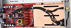 Bild 2: Schon der sichtbare Teil des Monomoduls ist ausschliesslich mit hochwertigen Bauteilen bestückt. Unter der verkupferten Abdeckung werkeln parallel 6x 10 parallel geschaltete Transistoren.