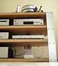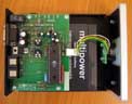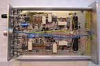 Bild: Innenleben mit 4 CC80 Verstärkern in roten Kunstoffkistchen und dem gefilterten Schaltnetzteil (rechts) der ersten Version