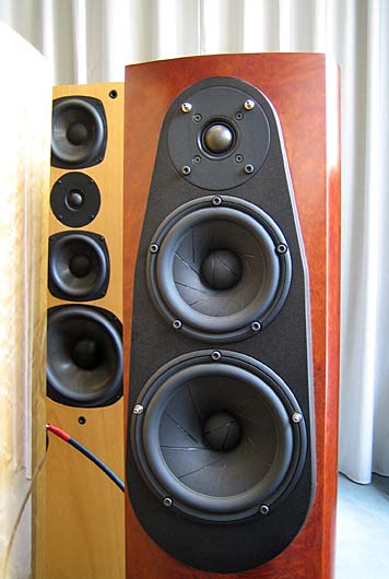 Das wenige Grad nach hinten geneigte Gehäuse wird in beiden Fällen mit dem Ziel einer zeitrichtigeren Wiedergabe begründet. Ein gutes Ziel; denn erfahrene Hifi-Hörer wissen, dass dies bei Mehrwegekonstruktionen nur sehr schwer zu erreichen ist. Die vergleichsweise schweren Tiefmitteltöner hinken hinsichtlich ihrer Impulsantwort den leichtgewichtigen (nur wenige Zehntelgramm) schweren Hochtöner-Membranen deutlich hinterher. Die notwendige Beschaltung mit Spulen führt zudem zu Phasenverschiebungen. Manchmal ist der Unterschied im Impulsverhalten so gross, dass der Hochtöner phasenverkehrt angeschlossen werden muss.