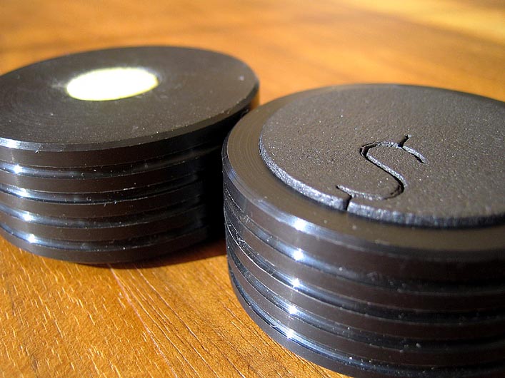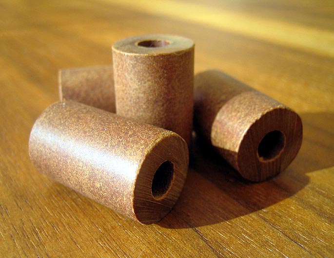 Pertinax oder Hartpapier ist ein Faserverbundwerkstoff aus Papier und einem Kunstharz. Das Material ist in Elektrik- und manchen Eisenwarenläden zu erwerben und dient oft als Isolator oder Träger für elektronische Bauteile. Da es aufgrund seiner Struktur und Materials ebenfalls eine ankoppelnde und zugleich leicht dämpfende Wirkung besitzt, erschienen mir Hörversuche nicht uninteressant. Zudem hatte ein kleiner Werkzeugladen gerade Hülsen in der passenden Grösse vorrätig. So hat es Pertinax ebenfalls in den Kreis der sich zu beweisenden Gerätefüsse geschafft. 4 Stück kosten ca. 6 EUR.