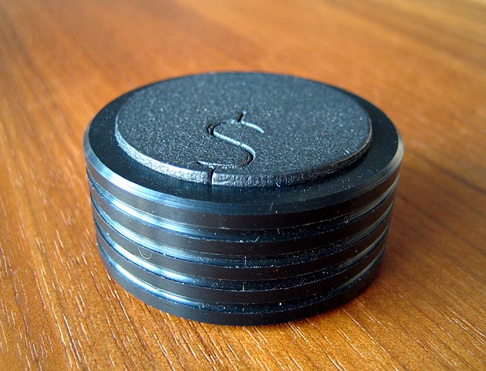 Anstatt von einfach abgedrehtem Kunststoffstangenmaterial (z.B. POM - übrigens auch sehr wirksam), spricht Audioplan von einem "speziell formulierten kohlegefüllten Material". Ob damit evtl. auch nur eine Kohlenstaub-Beimischung zum Kunststoff (zur Erzielung der schwarzen Färbung) gemeint sein könnte, lasse ich an dieser Stelle mal bewusst offen. Eine weitere Rechtfertigung des Preises erfährt das 3er-Set für ca. 70 EUR durch seine Anpassungsfähigkeit an den Dämpfungsbedarf von Gerät und Untergrund durch einen dreiteiligen Aufbau aus dem hochdämpfenden Sicomin Secrets (Einlage mit S-förmigen Schnitt), dem eigentlichen Antispike (schwarz) und einem kleinen Aramid-Pad (gelb), der auf der Unterseite einlegbar ist.