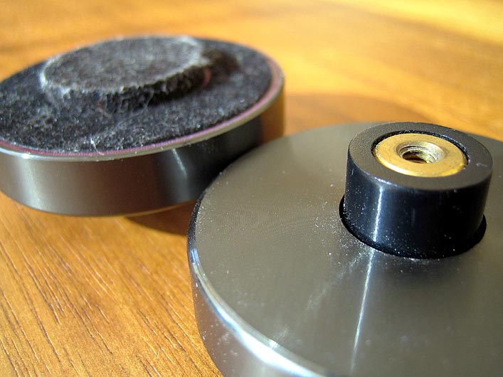 Das String-Suspension-Concept ist schon über 10 Jahre alt und geht auf den verblichenen Lautsprecherhersteller IQ zurück. Die entkoppelnde Wirkung von verspannten Stahlseilen, die eine gewisse Dämpfungswirkung haben und gleichzeitig eine schnelle Schwingungsableitung erlauben, hat sich in der Praxis bewährt und ist in ähnlicher Form auch schon mehrfach kopiert worden. Bei den SSC-Pucks kommt anstelle von Stahlseilen ein Kunststoffgewebe zum Einsatz, das die Verbindung des oberen gewindetragenden Teils zur Veschraubung mit dem Geräteboden und dem filzbewährten eigentlichen Puck übernimmt. Das 4er Set kostet ca. 70 EUR.
