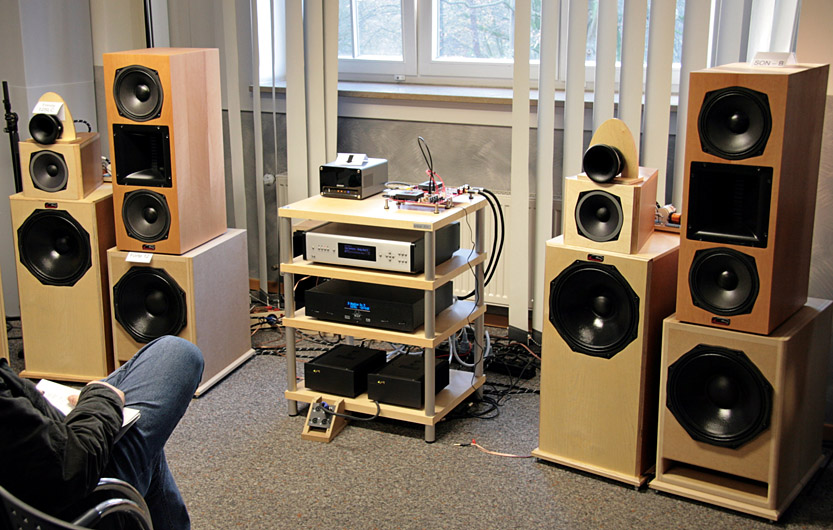 Ich hatte (auf einem mässig guten Sitzplatz) die Möglichkeit, mir die beiden Bausätzen Trinity 12SLC und SON-B-MK2 mit Forte 12 Subwoofer anzuhören. Betrieben wurden die beiden Lautsprecher über eine Anlage bestehend aus einem T+A Music Player, der von einer QNAP NAS-Server mit Daten versorgt wurde, einer Audionet MAP Vorstufe und zwei AVM M2 Monoendstufen. Die beiden Subwoofer Forte 12 hatten mit jeweils einem Inosic RAS 300 Aktivmodul ihre eigenen 300 W Verstärker.