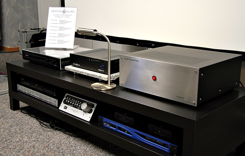 Bild 2: Aufbau der Vorführanlage - anstatt der Pure Dynamics Röhrenendstufe kamen allerdings zwei ClassD Monos von Flying Mole zum Einsatz.