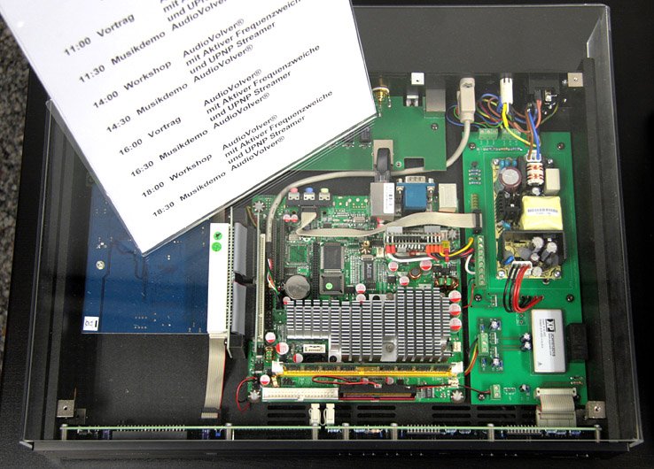 Für alle Skeptiker gibt es die Möglichkeiten des "zu Hause Ausprobierens" und nicht zuletzt den neuen günstigeren AudioVolver, sowie eine nochmals günstigere Bausatz-Version. Der neue "kleinere" Audiovolver von definiteAudio kommt in einem Standard-PC-Gehäuse mit eigener geschliffenen und lasergravierten 4mm Alu-Frontplatte. Zusätzlich zur PC-Hardware ist im Gerät ein Controller (für LEDs und Fernbedienung) sowie eine Zusatzplatine mit mehreren Cinch-Digitaleingängen eingebaut. Der Preis für den Bausatz dieses Gerätes wird bei knapp über 2.000 Euro liegen.