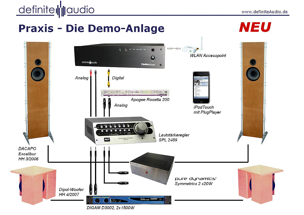 Die Abhöranlage (Bild 2 ganz oben, und Bild 1 unten) war spezieller Natur. Fast schien es, als ob bewusst sehr moderne und eher einfache Gerätschaften zur Vorführungen herangezogen wurden. Konnte man so die Segnungen der Korrektur-Rechnungen besonders eindrucksvoll demonstrieren? Als Zuspieler diente ein Notebook und ein Mediaserver, die über einen iPod-Touch "fernbedient" wurden. Einem AudioVolver II wurden die Digitaldaten über einen WLAN-Router zur Weiterverarbeitung zugespielt. Wegen der aktiven Auftrennung in Subwoofer- und Satellitenkanal, übernahm die D/A-Wandlung im Satelittenkanal ein externer Profi-DA-Wandler, der Apogee Rosetta 200. Die Lautstärkeregelung übernahm ein SPL SMC Surround Monitor Controller SMC 2489. Die Lautsprecher DaCapo wurden von den jweils 100 Watt starken ClassD Monoendstufen Flying Mole DAD M100pro angetrieben. Die eigentlich für diese Aufgabe vorgesehene 2x 20 Watt starke Röhrenendstufe Pure Dynamics Symmetrix kam aufgrund eines defekten Adapters nicht zum Einsatz. Die beiden Dipolsubwoofer DiSub 12-2 benötigten allerdings grössere Kaliber; die sie mit der PA-Endstufe Powersoft Digam D3002 auch erhielten. Deren maximal 2x 1.500 Watt an 2 Ohm waren auch für die leistungshungrigen Dipolsubwoofer mehr als ausreichend.