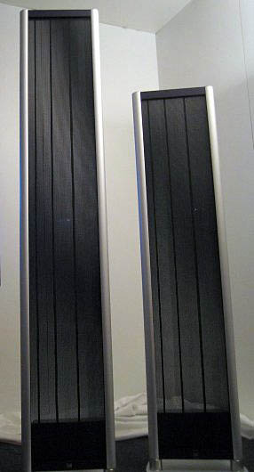 Wie die Antipoden zur vorigen Kette verhalten sich die mit ultramoderenen Prozessoren versehenen DVD- und CD-Spieler (Bild 2) zu den Avid Plattenspieler, und die mit allem Schnick-Schnack ausgestatteten Transistorverstäkern von Krell und Meridian zu den Röhrenverstärkern von Prima Luna. Ob sich das Klangbild auch so konträr zeigen sollte? Auch die Lautsprecher lassen dies vermuten. Anstelle der üblichen Hubkolbenschwinger in ventilierten Gehäusen, baut Final seine Elektrostaten in elegante Aluminiumpaneele. Die sehen meiner Meinung nach nicht nur besser aus als die bekannteren amerikanischen Hybride von Martin Logan - Messebericht High End 2005, sondern haben auch noch den Vorteil, dass sie wie die Magnetostaten von Magneplanar (High End 2005 und High End 2007) alle Frequenzen mit der Treibern der gleichen Bauart abstrahlen. Müde grummelnde schwere Bassmembranen in zu kleinen Gehäusen sind somit nicht möglich. Auf der anderen Seite soll natürlich nicht verschwiegen werden, dass die untere Grenzfrequenz eines Flächenstrahlers prinzipbedingt nicht so tief sein kann, wie einer schweren Hubkolben-Membran.
