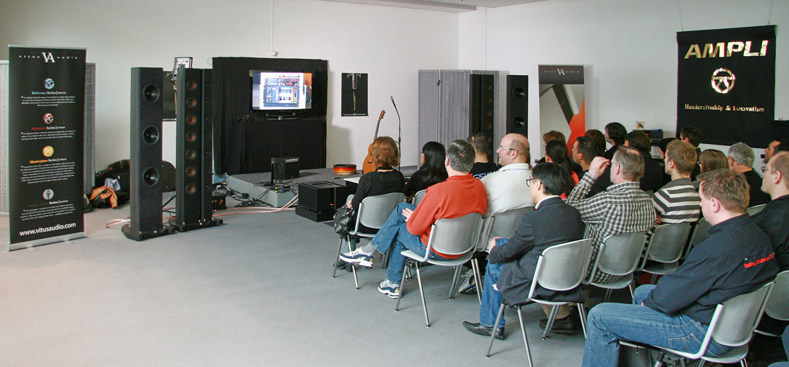 Bei meinem Besuch am gemeinsamen Ampli und Amphion Stand lief gerade eine Video-Vorführung über die Vinyl-Plattenherstellung über die Vitus-Audio- und Ampli-Anlage. Wie man dem Bild entnehmen kann war das allgemeine Interesse hieran gross. Mich persönlich hätten eher die klanglichen Qualitäten der modischen neuen Amphion Lautsprecher mit ihrem tief-angekoppelten Horn-Hochtöner interessiert. Eine parallele Vorführung war aufgrund der gemeinsam genutzten Räumlichkeiten aber leider nicht möglich.