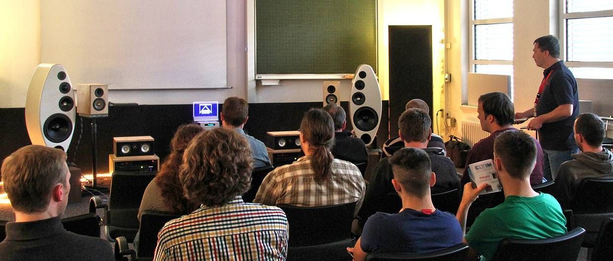 Bild 1: Die Vorführungen bei Hifi-Selbstbau sind zurecht immer gut besucht. Hier präsentiert Theo Winterscheid den neuen 2-Wege-Lautsprecher DUO-DXT.