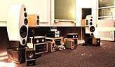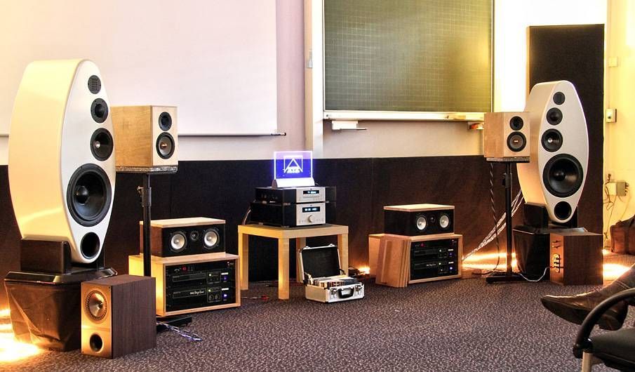 Bild 2 bis 4: Gesamte Vorführkette. Die zu Füssen des grossen 4-Wege-Aktiv-Lautsprechers Rockets stehende KEF Q300 diente als Vergleichslautsprecher vom Fertigmarkt. Ein fairer Vergleich, da sie nicht zu den schlechtesten Vertreterinnen ihrer Klasse gehört.