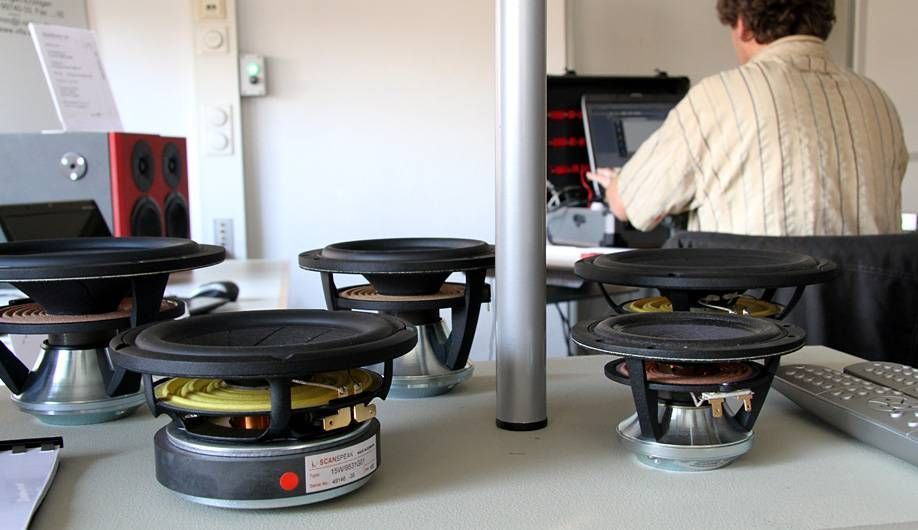 Bild 2: Edle ScanSpeak Chassis im Vordergrund. Gerd Lommersum misst im Hintergund.