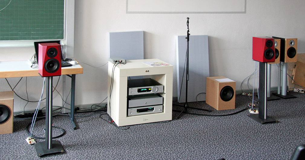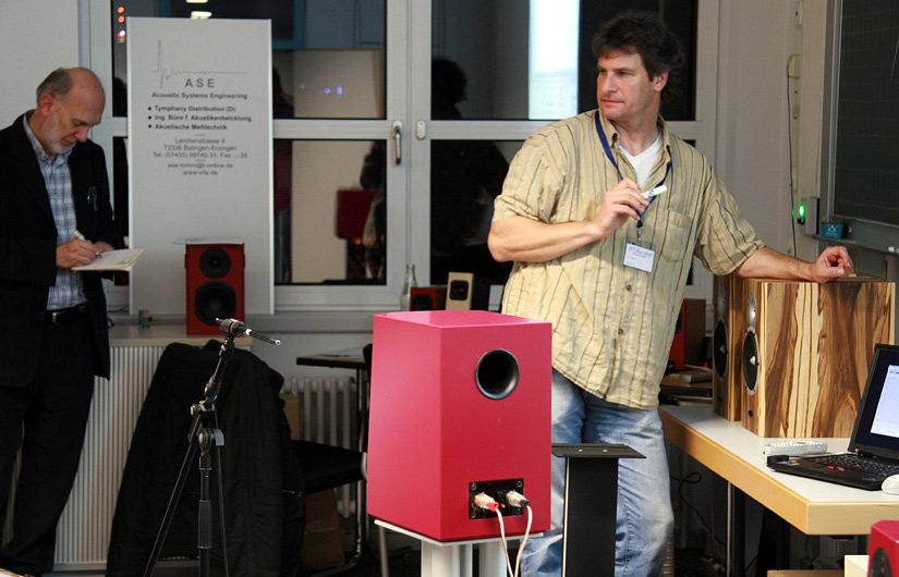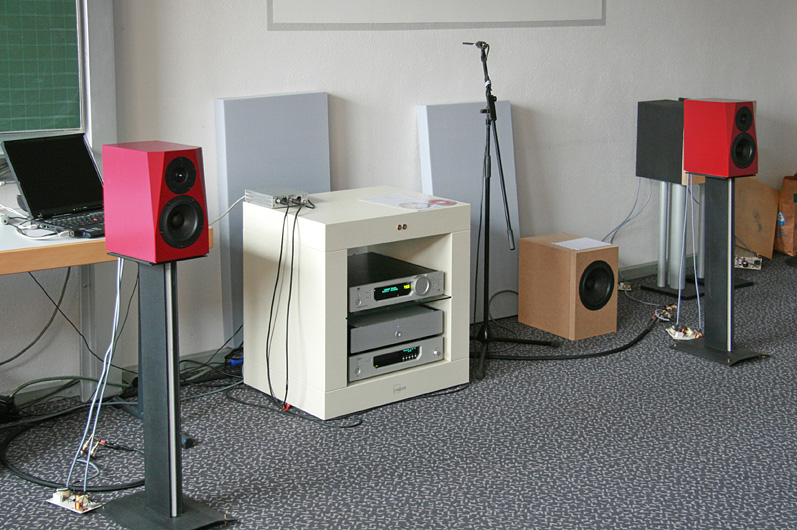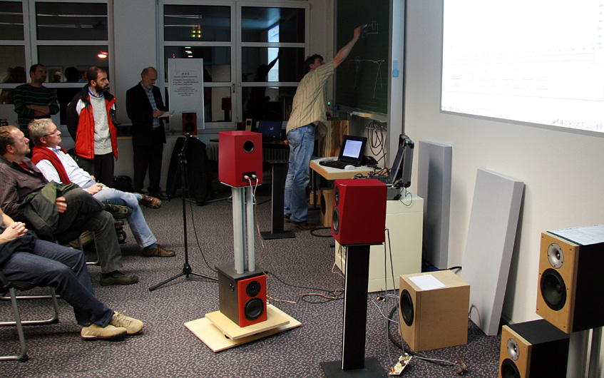 Herr Lommersum hatte einiges zu bieten: Vorträge über Messungen und Lautsprecherentwicklung; State-of-the-art-Chassis aus Skandinavien und Vorführungen von hochwertigen Bausätzen mit diesen. Den kleinen Zweiwegerich mit Vifa-Ringradiator (ohne Sub aufgrund fieser Raummoden) fand ich am gelungensten.