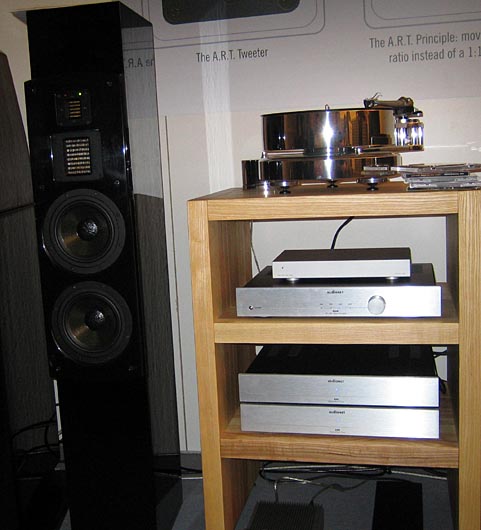 Zu den Lautsprechern brauche ich an dieser Stelle nicht viel sagen, habe ich dies doch schon in meinem Messebericht - High End 2004 getan und sind technische Details auch auf der Adam-Audio Seite nachlesbar. Die auf den Bildern zu sehende Column in schwarzen Hochglanz war als Aktivversion (kein Pixelfehler am Hochtöner, sondern eine grüne LED für Power On) zu hören. Diese Technik ist wohl den auch angebotenen Studiomonitoren entnommen, die technisch den üblicherweise passiven Hifi-Lautsprecher sehr ähneln. Für Begeisterung sorgte bei einigen Zuhörern ein preisgünstiges sehr kleines Kompaktmodell (nicht im Bild und noch deutlich kleiner als die abgebildete Compact), was zu Aussagen wie, einer der besten Lautsprecher der Messe, führte. Den neuen wuchtigen 4-Wege-Lautsprecher Tensor konnte ich aus Zeitgründen leider ebenfalls nicht hören.