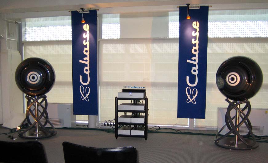 Kurz vor Ende des ersten Messetages startete ich noch den Versuch mir den Eye-Catcher diesjähriger Messe anzuhören: Den monströsen 4-Wege-Axial-Medizinball La Sphere (Bild 1) von französichen Koaxial-Spezialisten Cabasse. Angesichts der zu bezweifelnden akustischen Vorteile einer 4-Wege-Box (und insbesondere einer axial aufgebauten), der extremen wohnraumunfreundlichen Optik und des Paarpreises von angeblich 100.000 EUR, ist es müssig über die tatsächlichen klanglichen Qualitäten dieses Lautsprechers zu urteilen. La Sphere ist wohl eher als Technologieträger oder noch wahrscheinlicher als Imagebotschafter für die Kompetenz von Cabasse axiale Treibersysteme zu entwickeln. so zeigte auch ein ausgestelltes Schnittmodell der La Sphere welch technischer Aufwand getrieben werden muss um nun auch noch ein viertes riesiges Tiefton-Chassis axial anzuordnen. Drei Wege gibt es ja schon länger von Cabasse auf einer Linie.
