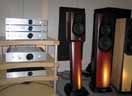 Während der Vorführung spielte Phonars Topmodell Credo S100 betrieben am Music Hall Stereoreceiver Maven und den CD-Player CD25.2. Der CD-Player (unten im Bild) ist angesichts des Verkaufspreises von ca. 550 EUR überraschend hochwertig - in technischer und klanglicher Sicht. Ist man heute selbst in der 1.000 EUR-Klasse und darüber Billiggehäuse, kleine Netzteile, PC-DVD-ROMs und abgespeckte Platinen gewöhnt(schliesslich muss Abstand zu noch teureren Modellen gehalten werden), zeigt der Music Hall eine dicke Alufront, gute Verarbeitung und ein Innenleben wie man es in manchem 2.000 EUR Player findet. Die Fertigung in Fernost machts möglich. Diese nutzt das Gros der Konkurrenz auch. Die reichen den Kostenvorteil aber meist nicht an die Kunden durch. Warum auch? Will man in der Fachpresse in die Topklasse der Bestenlisten, muss das Gerät auch so viel kosten, wie die sich dort befindenen Mitbewerber. Ansonsten geriete dort die fein säuberlich herausgearbeitete Markenhierarchie durcheinander - aber das ist ein anderes Thema und schon unter Das Highend-Dilemma beschrieben. Zurück zur Kette: Als Verstärker fungierte nicht der passende a25.2 (im Bild das unterste Gerät des Stapels) der ebenfalls zum fairen Tarif von ca. 600 EUR zu haben wäre, sondern schon genannter Receiver Maven (in der mittleren Ebene des Racks). Der steht mit schon happigeren 1.500 US-Dollar in den Preislisten. Neben einem Radiotuner erhält man allerdings noch einen hochwertigen DA-Wandler und eine doppelt so starke Verstärkerstufe mit 2mal 100 Watt. Wie mir ein Bekannter berichtete sorgte der Maven im Vergleich zum kleineren a25.2 an der Credo S100 für deutlich mehr Druck in den unteren Lagen und ein besseres Auflösungsvermögen. Für diesen Vergleich hatte ich leider keine Zeit, würde allerdings auch von einem entsprechendem Unterschied ausgehen. Die hervorragende Phonar Credo S100 schliesslich ist für mich eine alte Bekannte aus dem Hörraum meines Lieblingshändlers und von der High End 2004. Der entsprechende Kurzbericht von der High End 2004 ist unter Berendsen und Phonar nachzulesen.